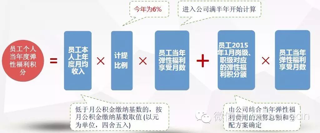 員工本年度彈性福利積分=員工本人上年度月均收入*計提比例(6%)*員工當年彈性福利享受月數