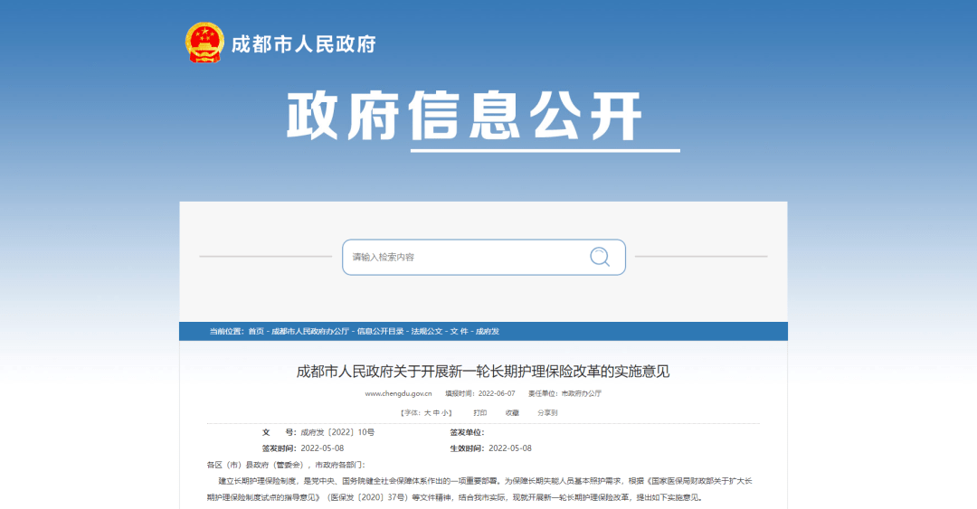 內容:從2022年1月1日起,在全市范圍內試點長期護理保險。試點期間,參加重慶市城鎮職工基本醫療保險的人員同時參加我市長期護理保險。通知明確將全市所有區縣納入擴大長期護理保險制度試點范圍。