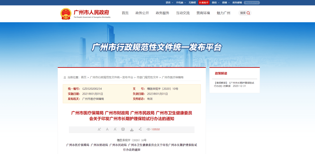 政策依據:《廣州市長期護理保險試行辦法》(穗醫保規字〔2020〕10號)