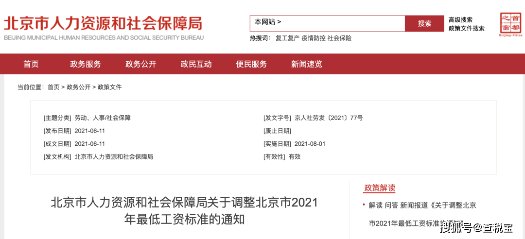 2022年7月初,北京市人力資源和社會保障局發文明確,2022年北京市最低工資標準不調整: