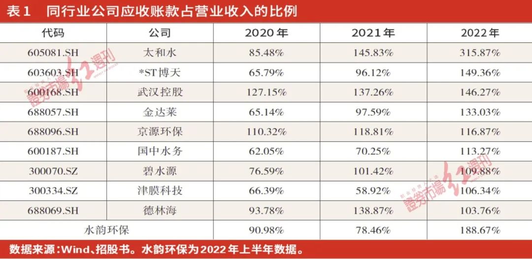 就水韻環保招股書披露內容來看,其已經存在上述公司類似憂慮。報告期內,水韻環保應收賬款金額分別為1.63億元、1.99億元、2.98億元和3.31億元,呈現出不斷增加的趨勢,相關金額占營業收入的比例分別達67.35%、90.98%、78.46%和188.67%。要知道,這一數據還不包含應收票據、應收款項融資、合同資產等應收項目,如果算上這些費用,則其應收部分占營收的比例將達到68.59%、113.44%、107.05%和246.71%。其中,2020年、2021年和2022年上半年,應收部分金額已經超過當年營業收入金額。這種情況說明,公司當期的經營業務并未收到現金,全部形成了應收款項。