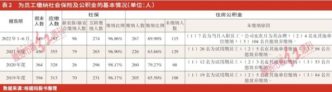 據招股書披露的員工繳納社會保險及住房公積金情況,2022年1~6月,水韻環保期末員工人數有549人,然而實際繳納五險的人數僅為274人,繳納五險人數占期末員工人數的比例僅為49.91%;繳納住房公積金的人數為267人,占期末員工人數的比例為48.63%。這意味著,2022年上半年,水韻環保只為不到一半的員工繳納了五險一金。