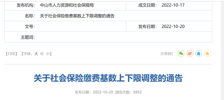 2022年10月20日,中山市人力資源與社保保障局發布了《關于社會保險繳費基數上下限調整的通告》。