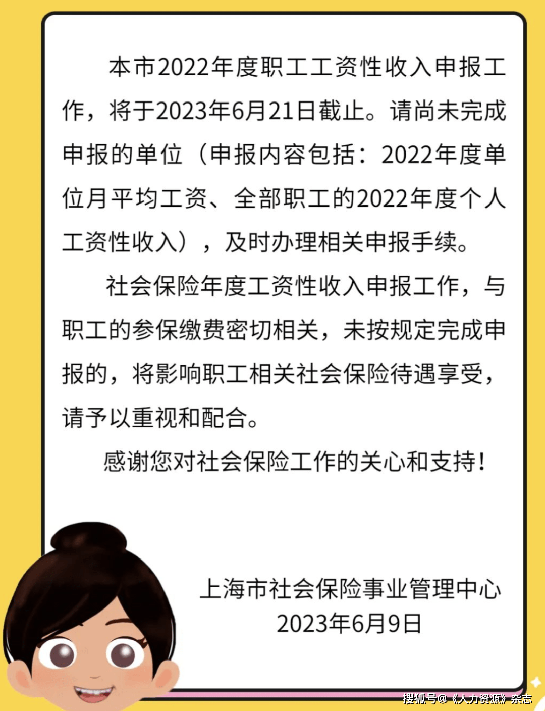 2023年6月9日,上海人社官方微信再次發布了《關于2022年度職工工資性收入申報工作的重要通知》,明確上海市2022年度職工工資性收入申報工作將于2023年6月21日截止。