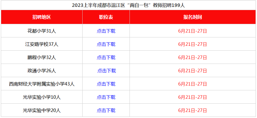 感興趣的可以關注今天成都溫江區最新發布的“兩自一包”教師招聘,報名時間6月21-6月27日。通過審核的人員進行兩輪面試進行選拔,第一輪現場答辯,第二輪無學生試講。