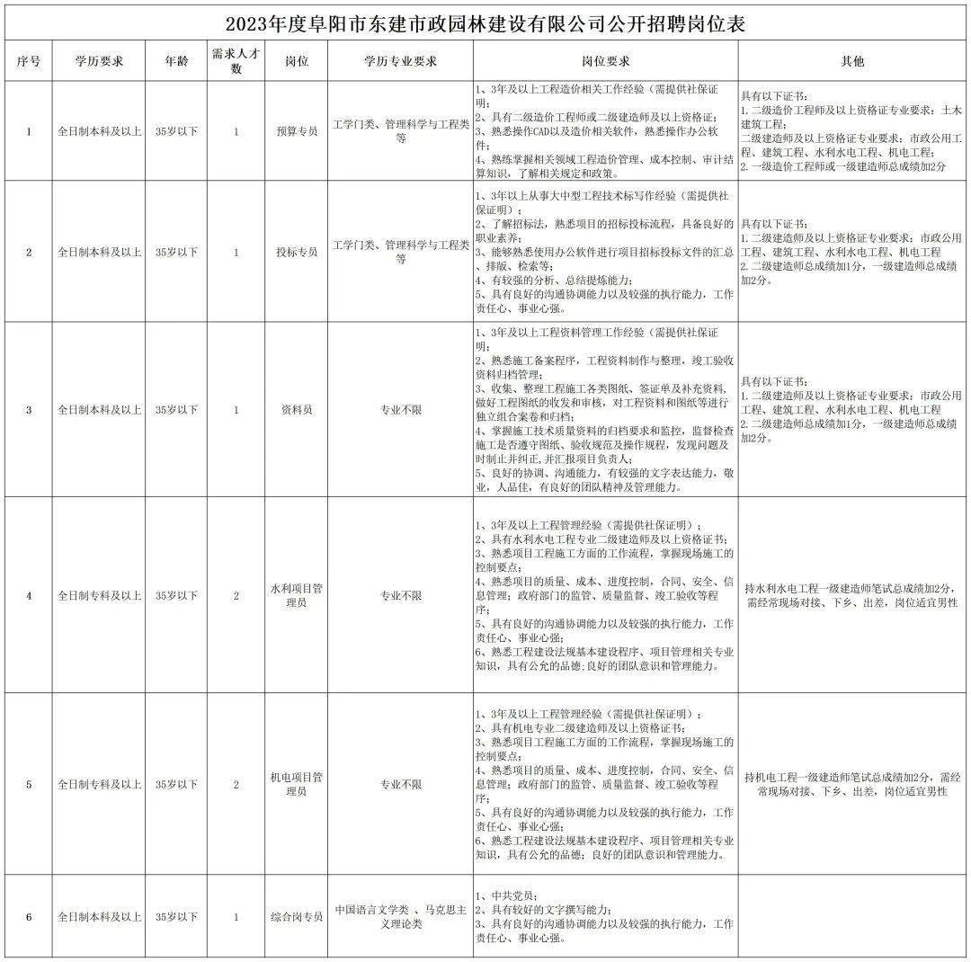 具體招聘崗位及要求詳見附件1《2023年度陽市東建市政園林建設有限公司公開招聘崗位表》。